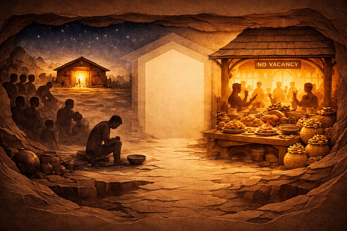 3. Creating room requires actual poverty, hunger, and grief. Covenant faithfulness isn’t about performing charity from fullness or fasting from a position of security. It requires genuinely reducing our wealth until we experience vulnerability, reducing our consumption until we know hunger, and allowing ourselves to mourn what we’ve been avoiding. The kingdom comes only to those who have room - and room requires emptiness we’ve spent our lives eliminating.